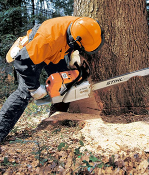 Этот способ один из самых быстрых и простых. Его можно применять на свободных лесных территориях, где не будет риска повредить постройки, заборы и другие близлежащие элементы ландшафта. Но нужно понимать, если вы собираетесь спиливать дерево целиком – будьте готовы, что почва вокруг объекта будет повреждена. Все из-за того, что само дерево весит тонны, и при падении почва продавливается под таким большим весом.
