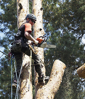 В тех случаях, если дерево – аварийное. Данный способ будет дороже и требует специального снаряжения для подъёма на дерево и для организации оттяжки. Также необходимо иметь свободный радиус 5-10 метров для падения дерева, во избежание нанесения вреда окружающим.